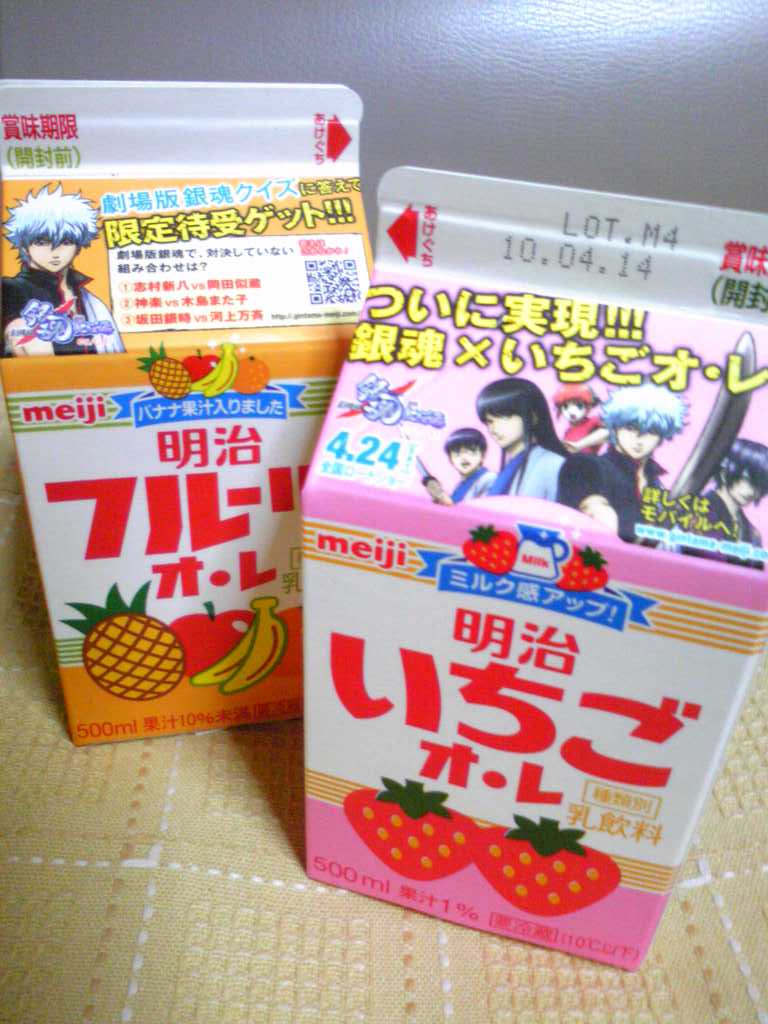 いちごオレは新八、フルーツオレの方は銀さんの格言入りのを入手できました。きゃほーい。